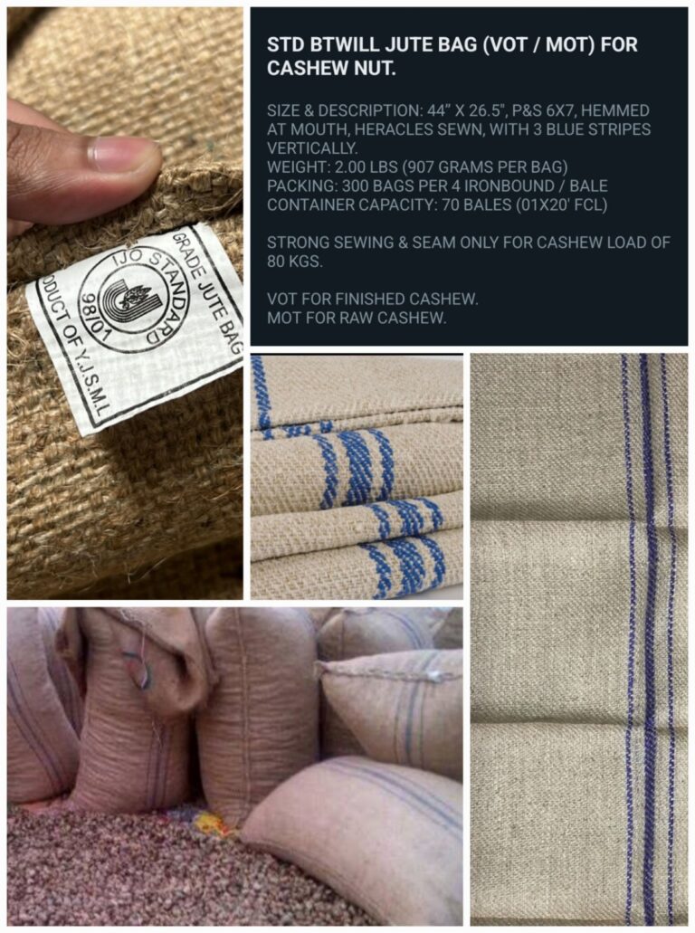 A durable, breathable jute sack designed for safe storage and transportation of raw cashew nuts while preserving freshness and quality.
